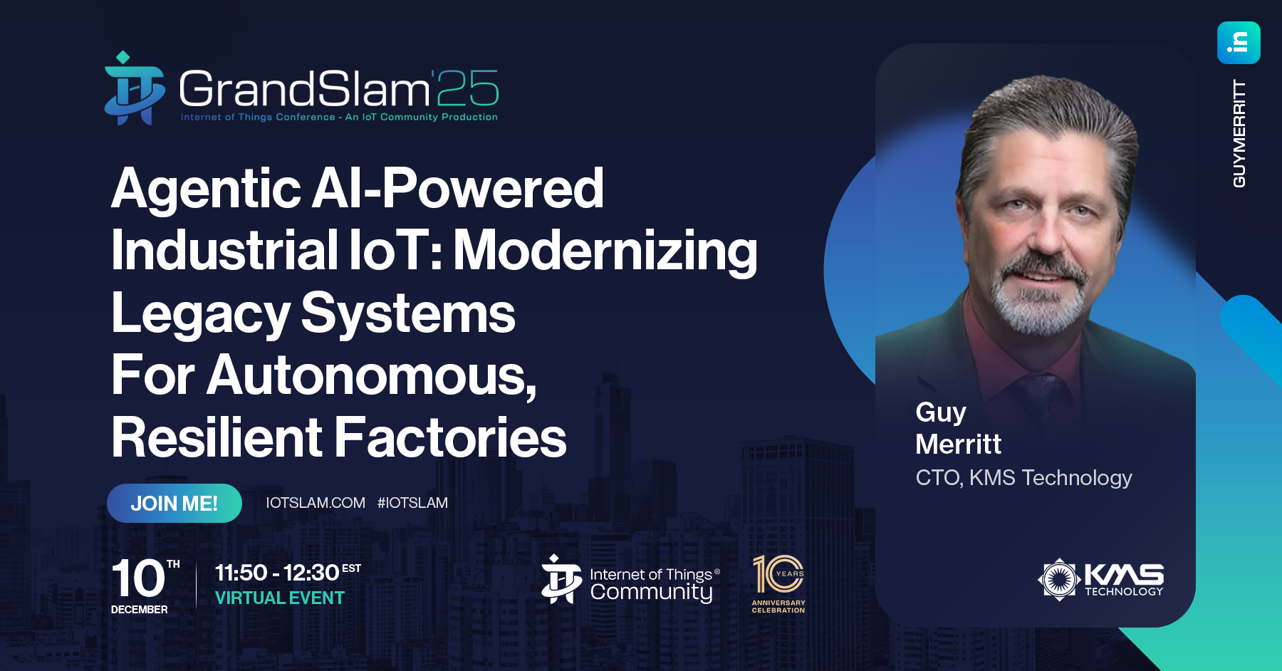 KMS Technology will participate in the IoT Grand Slam 2025 event, taking place December 10th. As part of the program, Guy Merritt, CTO, KMS Technology, will deliver a headline keynote address: Agentic AI-Powered Industrial IoT: Modernizing Legacy Systems for Autonomous, Resilient Factories.
