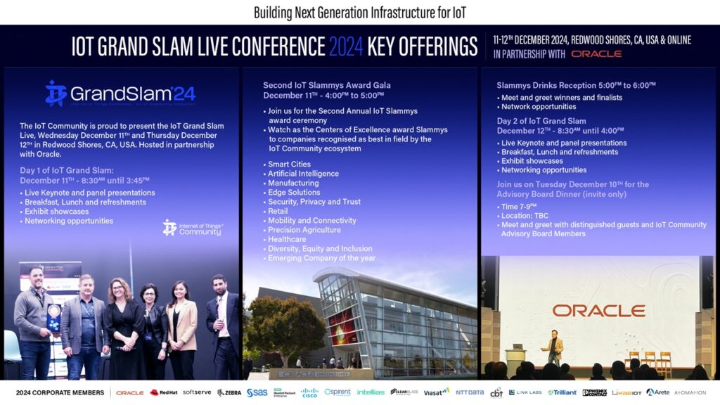 “On behalf of everyone at the IoT community we are thrilled to bring the IoT Grand Slam Live 2024 – our twenty-ninth IoT Slam event to the West Coast for the first time,” said Kevin Grant, Chief Marketing Officer of the IoT Community. “The event will deliver an exceptional agenda, filled with expertise, diverse perspectives, and fascinating insights you can apply to your business or organization. We thank Oracle for hosting the IoT Community and our many members. We look forward to another great event that will culminate with the crowning of the second annual IoT Slammys Awards winners.”
