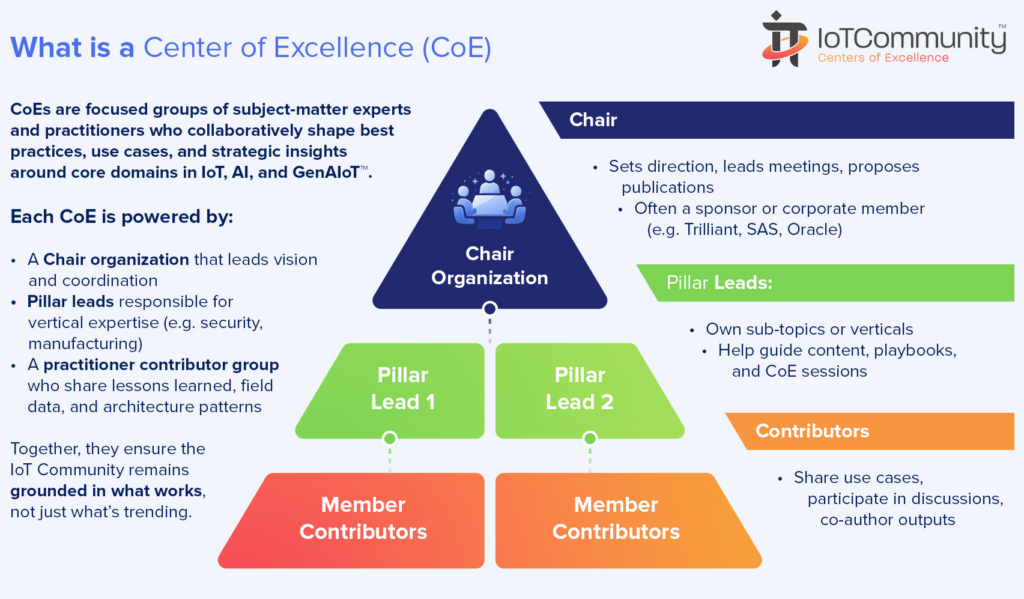 - Leadership: Each CoE is chaired by an industry practitioner, with a steering committee and IoT Community® as operator.