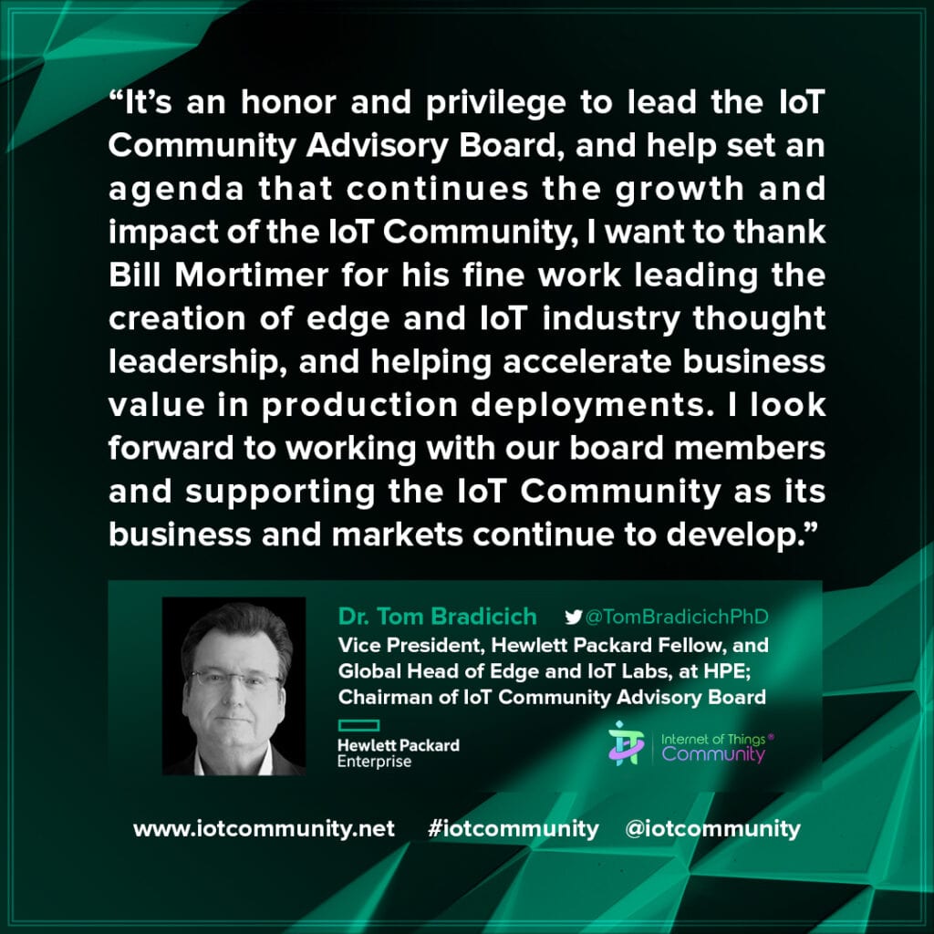 “It’s an honor and privilege to lead the IoT Community Advisory Board, and help set an agenda that continues the growth and impact of the IoT Community,” commented Dr. Tom Bradicich. “I want to thank Bill Mortimer for his fine work leading the creation of edge and IoT industry thought leadership, and helping accelerate business value in production deployments. I look forward to working with our board members and supporting the IoT Community as its business and markets continue to develop.”