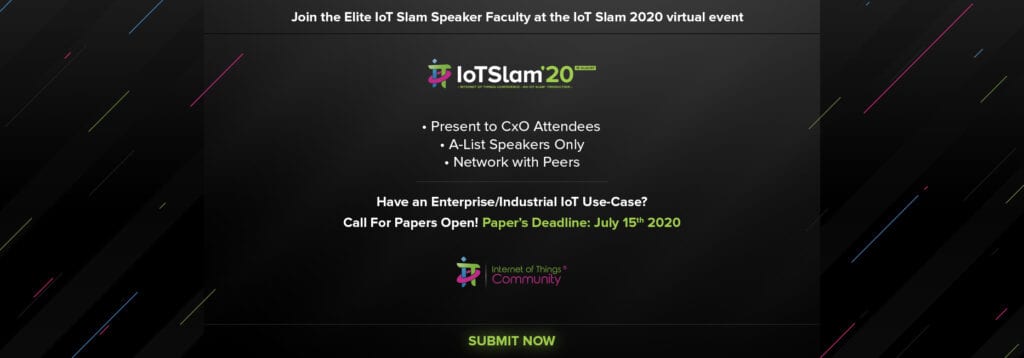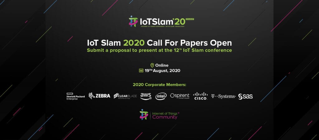 London, UK June 18th, – The IoT Community® (Internet of Things Community®), the world’s largest community of corporate executives, IoT professionals and practitioners, today announced a call for papers and speakers, for the next installment of its coveted IoT Slam® series of events – the IoT Slam 2020 Virtual Internet of Things conference, commencing August 19th, 2020.