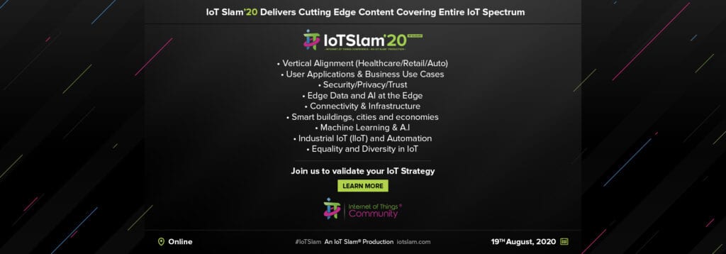 The IoT Slam 2020 is the Internet of Things Community’s twelfth international conference, covering a horizontal industry perspective, across the entire spectrum of IoT. The IoT Slam 2020 takes place August 19th, 2020 virtually in the cloud. For more information, visit www.iotslam.com. IoT Slam delivers the best in class IoT Strategy, Leadership, Advisory and Methodology – (SLAM)™.