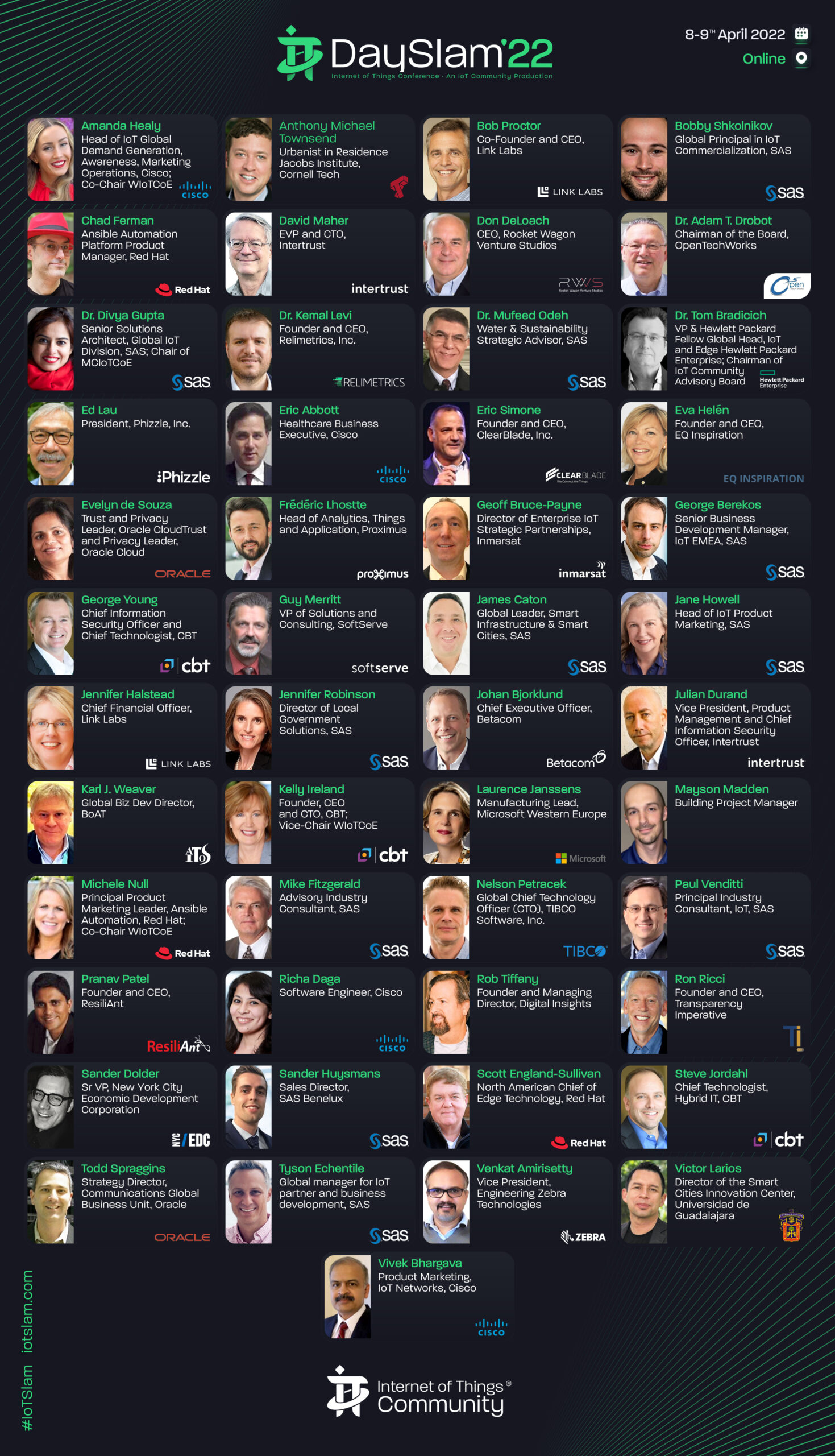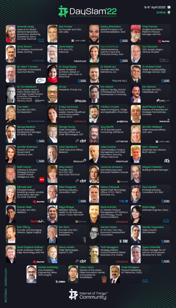 The IoT Day Slam 2022 conference features expert contributions from elite IoT practitioners at leading-edge organizations that are corporate members of the IoT Community including: HPE, ClearBlade Inc, SAS, Zebra Technologies, CBT, Cisco, TIBCO, Inmarsat, Link Labs, Oracle, Phizzle, Spirent, Red Hat, Intertrust, SoftServe amongst other leading industry players, and IoT Practitioners from the IoT ecosystem. The full list of speakers can be viewed here: https://iotslam.com/iot-day-slam-2022-speakers/
